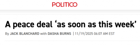 Так о чём же они все говорят? Вчера вечером Барак Равид из Axios раскрыл подробности секретного мирного плана, разработанного непосредственно Белым домом и Москвой. Равид сообщает, что высокопоставленный представитель Белого дома Стив Уиткофф провёл трёхдневные переговоры с российским переговорщиком Кириллом Дмитриевым в Майами в конце прошлого месяца, и что мирный план из 28 пунктов теперь находится на рассмотрении. Вчера вечером представители администрации Трампа сообщили, что они находятся на грани серьёзного прорыва. Это очень важно.