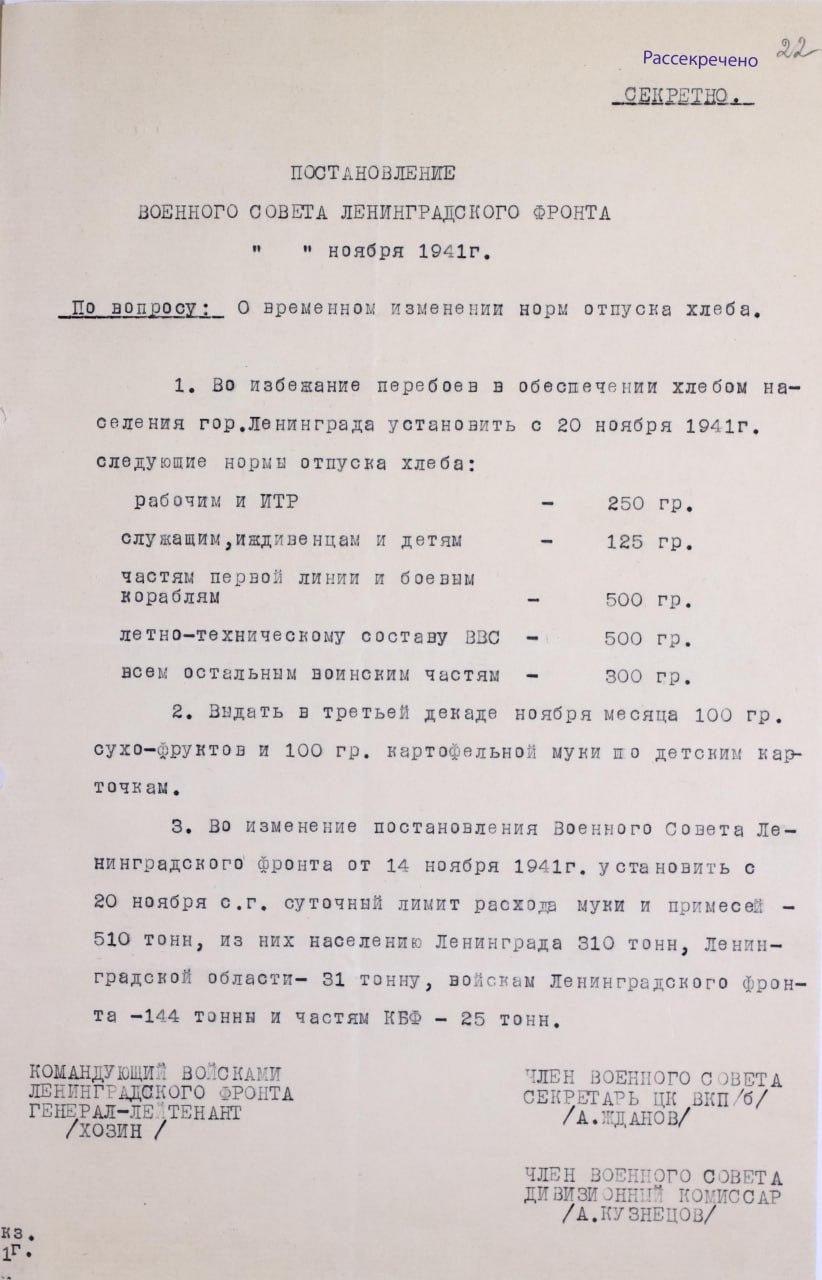 Кроме того, как видно из записки, рассматривался также вопрос о снижении норм и до 200 и 100 граммов в день соответственно. В случае даже незначительных задержек поставок или ухудшения ситуации на фронте, которые могли принудить власти к ещё большей экономии, вполне возможно, что именно цифра "100", а не "125", стала бы цифрой смерти Ленинграда.