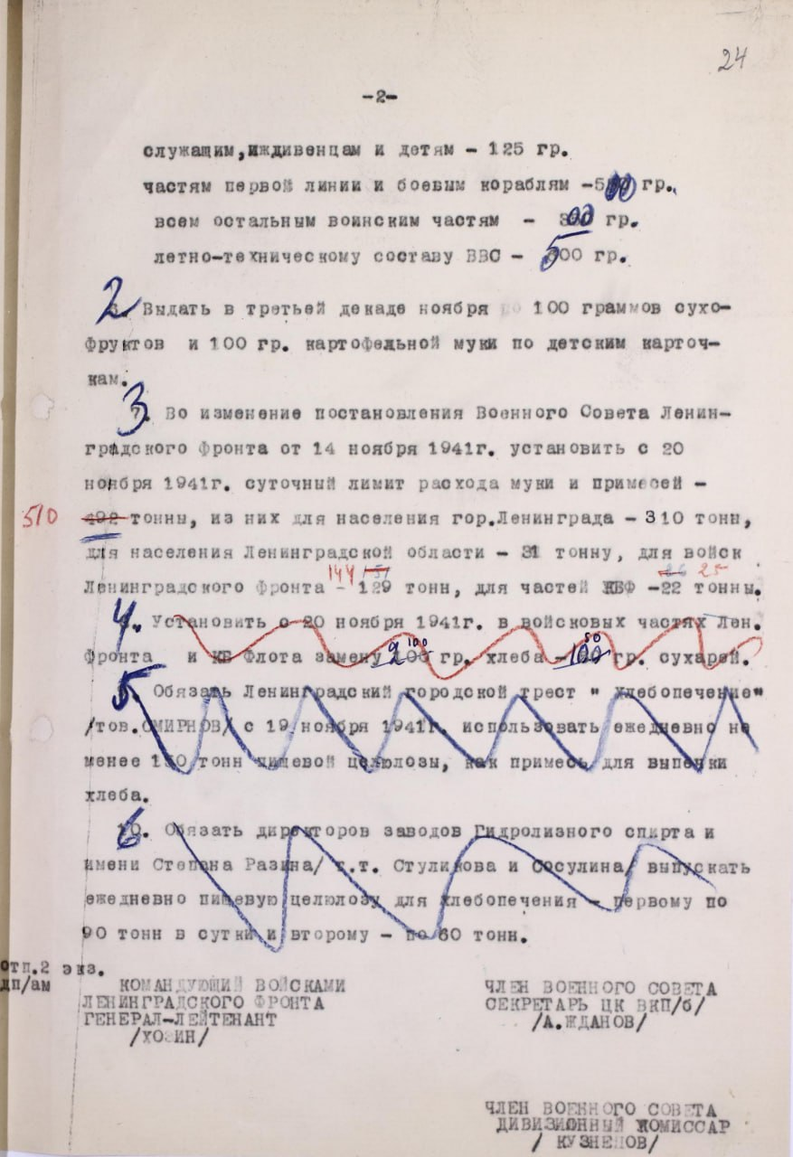 Не менее ценным оказался проект постановления Военного Совета Ленфронта, где указано желаемое поступление муки в 1000тн в сутки с момента открытия ледовой трассы. На каких предпосылках были основаны такие ожидания руководства города и фронта и о чём оно думало, сказать сложно. В порядке предоставления контекста напомню, что первый конный обоз доставил 21 ноября 60 тонн муки (по данным начальника ледовой трассы М.Нефёдова - 19,5тн), а 23 ноября грузовики привезли 70тн. Желаемой цифры в 1000тн смогли достичь только через месяц, причём в конце декабря3 из-за снежных буранов и атак немецкой авиации дневной завоз упал до 600 тонн, из которых мука составляла 2/3 объёма.