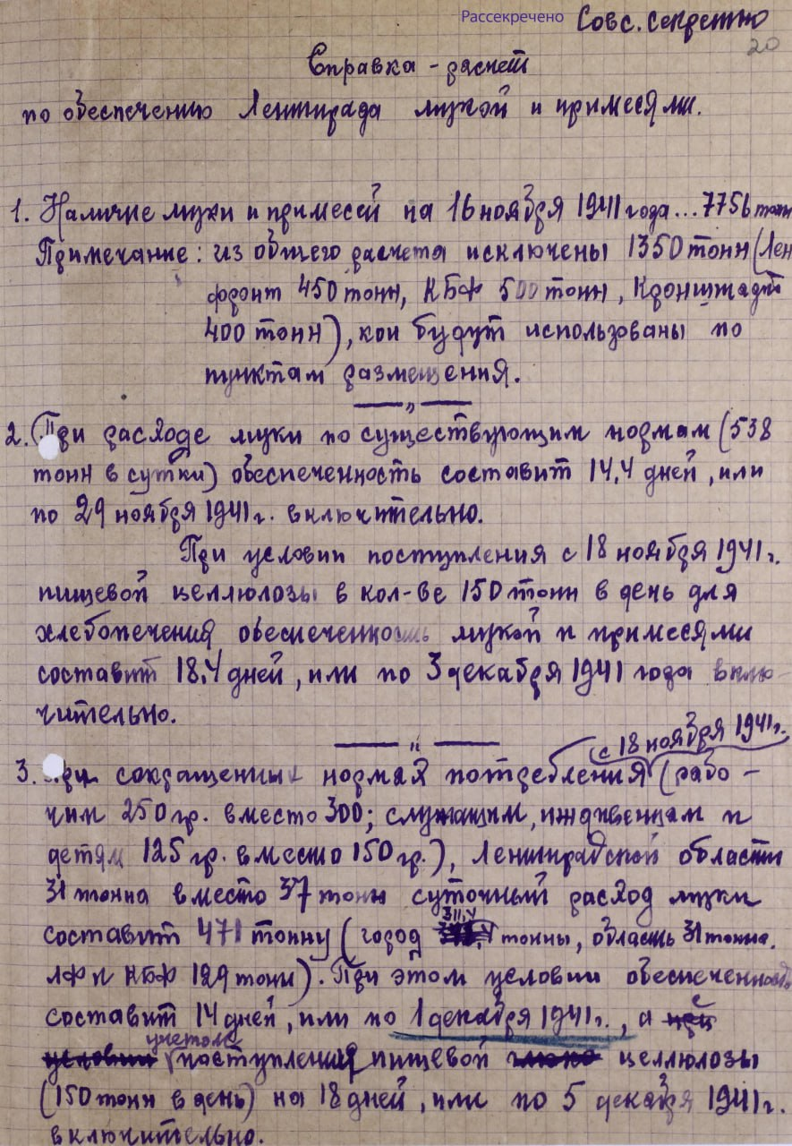 Сегодня, 84 года назад, в Ленинграде были установлены самые низкие нормы выдачи хлеба за весь период блокады. Мне удалось найти оцифрованную докладную записку1, которая проясняет несколько вопросов в отношении общего объёма запасов к 20 ноября 1941 года, динамики их расходования и количества муки, которое расходовалось на выпечку хлеба в день.