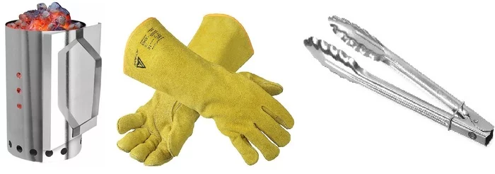 Для упрощения работы с самоваром пригодится такой набор: кружка-стартер, спилковые краги и щипцы для готовки.