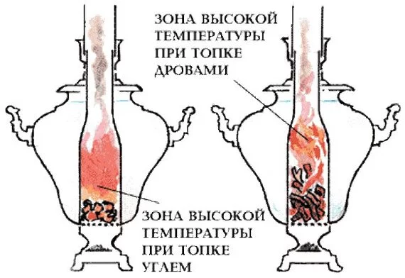 При топке самовара дровами распределение температур по высоте жаровой трубы получается другим. Наиболее сильно жаровая труба нагревается в зоне сужения, то есть в верхней части теплообменника; в нижней же части топки совсем нежарко, так что нагрев воды происходит в основном у крышки самовара. Нагретая и более легкая вода так вверху и остается, а конвекция не возникает.