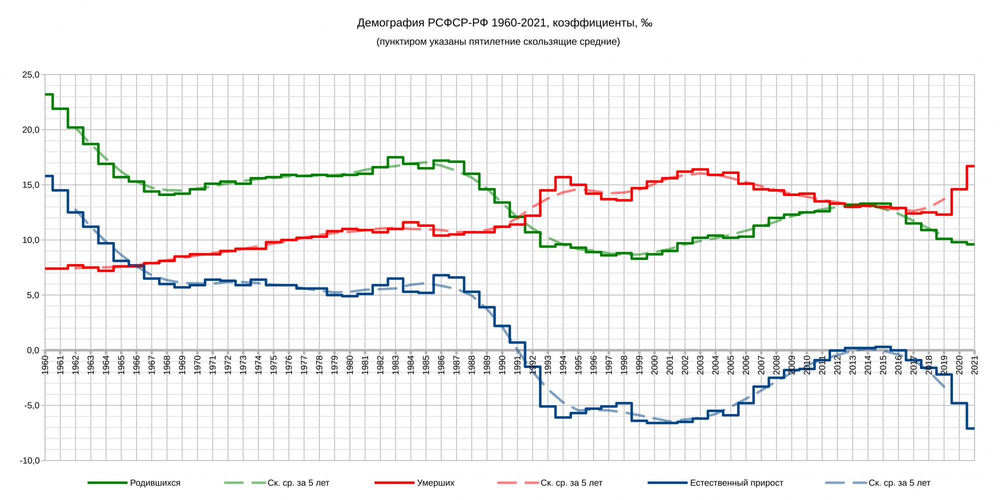 И кстати, рождаемость в РСФСР в 1967 году – 1 851 041; смертность – 1 017 034; естественный прирост – 834 007. Это была нижняя точка первой послевоенной волны. После войны (1941-1945) показатель рождаемости объективно не мог выйти на довоенный уровень. Те миллионы, чьи жизни забрала война, уже никого не родили. Так что в РСФСР-РФ пониженные показатели не только по рождаемости (в целом), но и по смертности довоенных поколений!