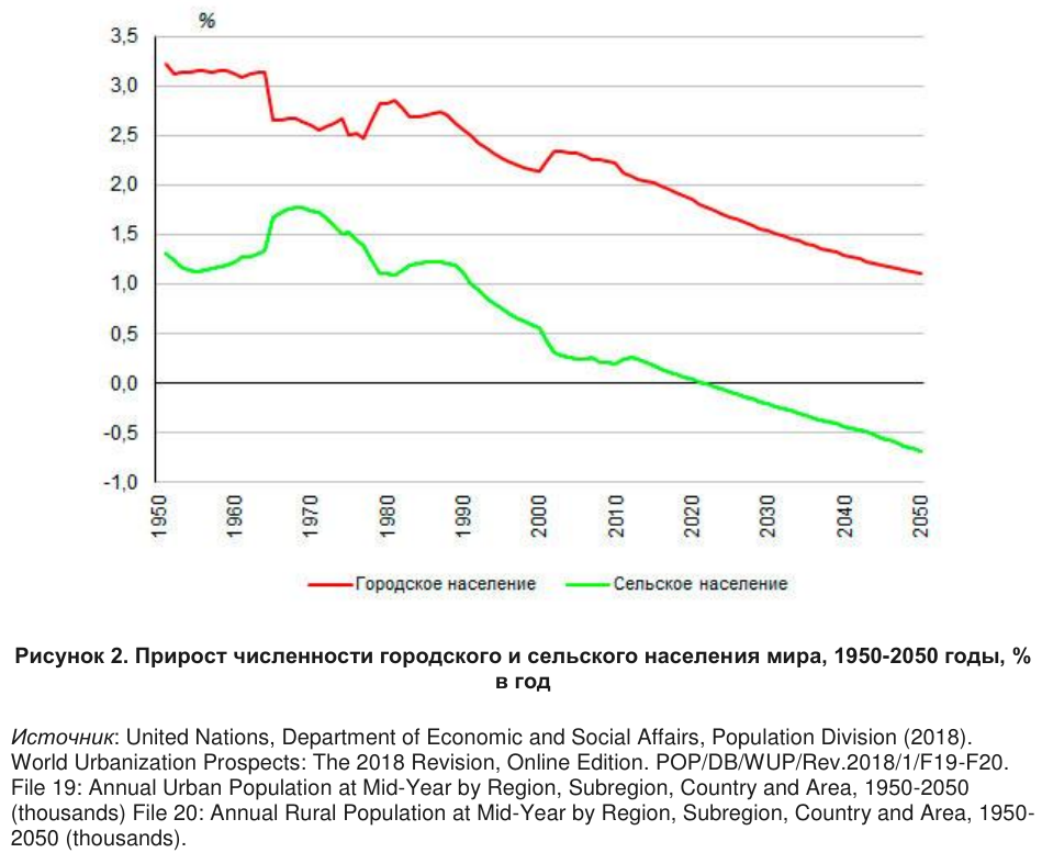 В 2020 г. прекратился прирост и воспроизводство сельского населения мира. График интересен еще тем ,что на нем рекрасно видна картина зависимости города от притока сельских жителей в него. Когда по тем или иным причинам сокращался отток сельского населения в города, прирост численности на селе резко возрастал, а в городе зеркально падал.