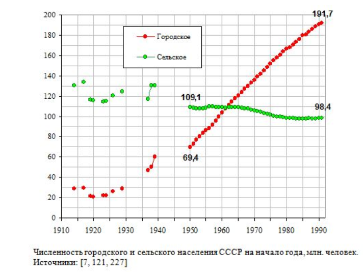 Зато при СССР сокращалось только сельское население, зато драматическими темпами. Что-то не вяжется вас тезис о заботе советской власти со статистикой.