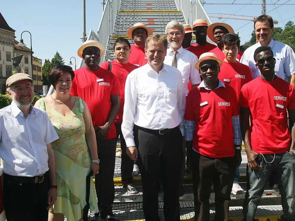 При этом, испытания миграционной политики велись всё в том же клоунском гриме. «Не обращайте внимания, это такая немецкая глупость». Летом 2013 года на вокзале в Гмюнде начался ремонт подземного перехода к платформам. В качестве временно меры – чтобы люди могли попасть к поездам и обратно – был сооружен мост поверх путей, пятьдесят ступенек вверх и столько же вниз. Думаю, вы можете себе представить, как это обрадовало мам с колясками, людей с тяжёлым багажом и так далее. «Дойче Бан» на все претензии только разводил руками. Тут на сцену вышел Арнольд, и, поправив радужный парик, сделал блестящее предложение: