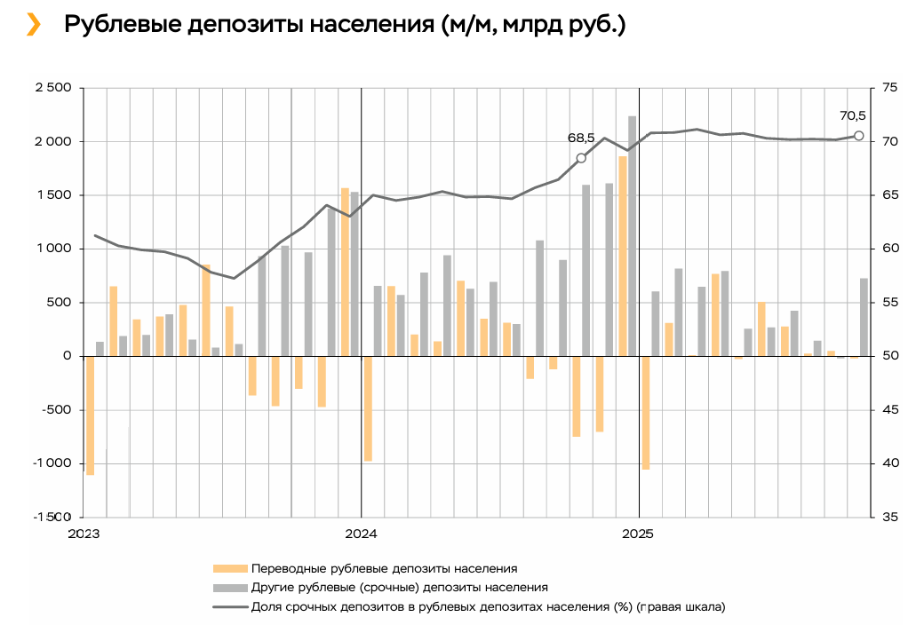 Доля срочных депозитов в рублёвых депозитах населения составила 70,5%.