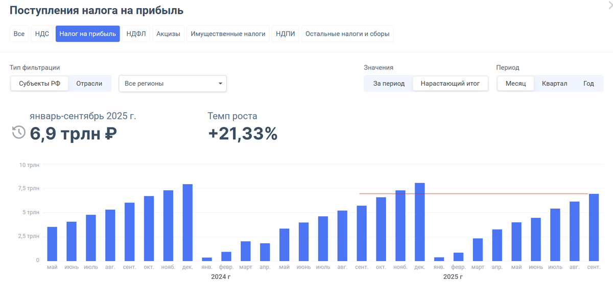 По данным Аналитического портала ФНС России, поступления налога на прибыль (предприятий) за период январь-сентябрь 2025 года вырос на 21,33% по сравнению с аналогичным периодом прошлого года. 6,9 трлн ₽ против 5,7 трлн ₽.