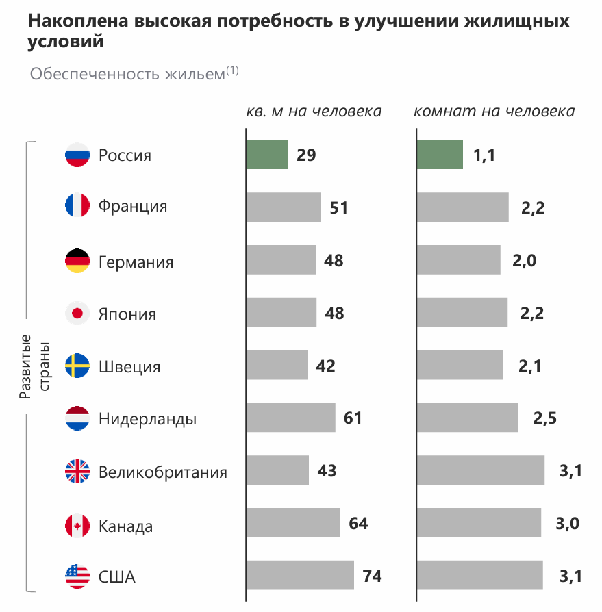 В своей презентации компания ДОМ.РФ сообщила о накопленной высокой потребности в улучшении жилищных условий россиян. Так, на 2024 год обеспеченность жильём составляет 29 кв.м. на человека. И 1,1 комната на человека. Здесь мы заметно отстаём от так называемых развитых стран. К примеру, в США обеспеченность жильём составляет 74 кв.м. на одного юнита.