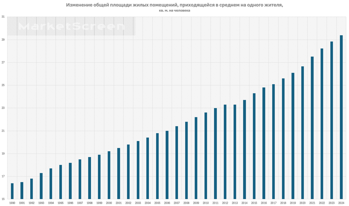 Впрочем, если мы обратимся к динамике, то она обнадёживает. Да, 29 кв.м. – мало. Но в 1990 было всего 16,4. Кстати, по статистике в сельских населенных пунктах цифра уже 31,25 на человека. И это тоже логично.