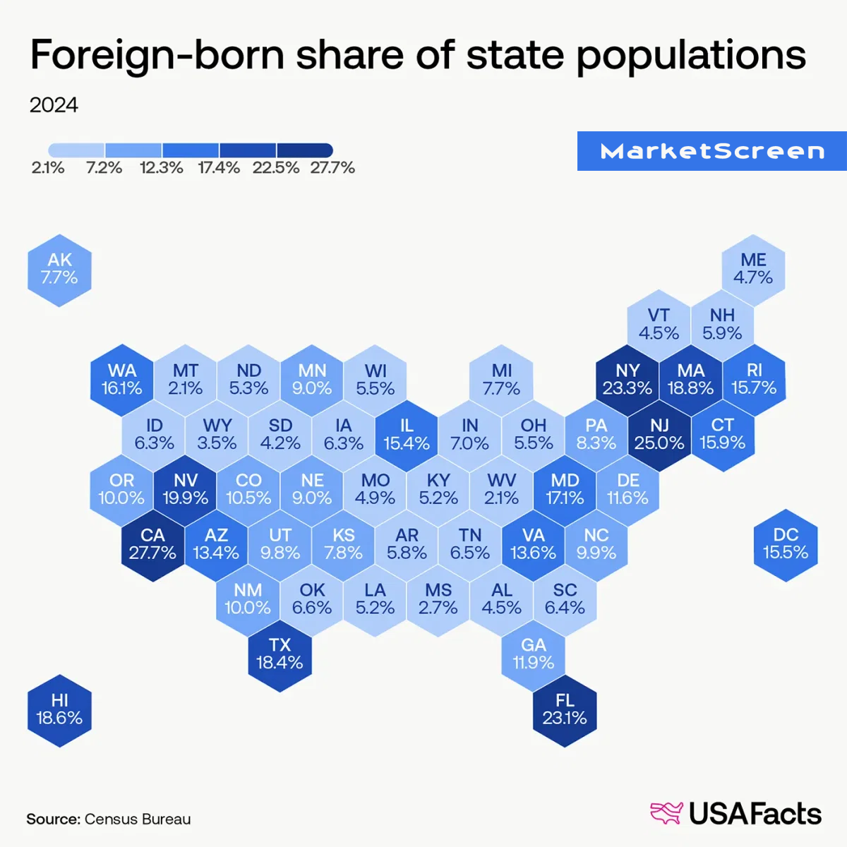 На данной картинке изображен процент населения каждого из американских штатов, который не был рождён в США. Ну т.е. понаехи.