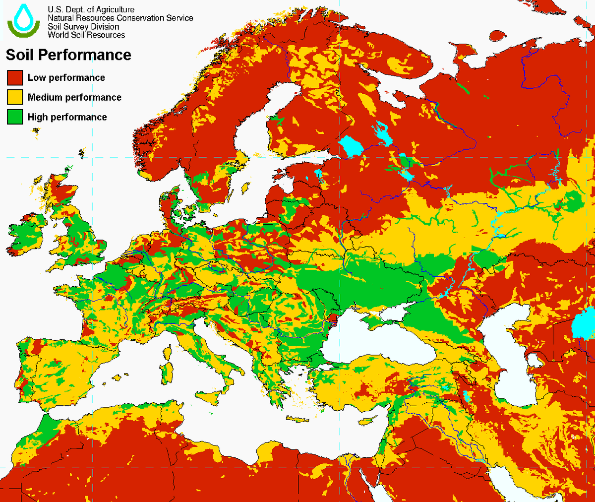 Обнаружил на просторах интернета карту американского сельскохозяйственного Департамента, показывающую эффективность земледелия в Европе.