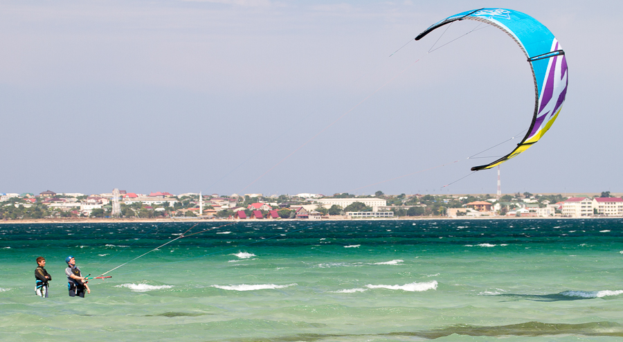 Примечание: если поставить второго сёрфера значительно позади первого, то вместе, управляя одним кайтом, они добьются вертикальности тросов, по которым бегают люльки.