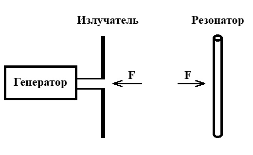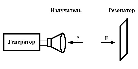 Можно предположить, что в установившемся режиме работы излучатель и резонатор станут волнами давить друг на друга в противоположные стороны с совершенно одинаковой силой F. Именно это и может являться причиной неработоспособности многих конструкций электромагнитных двигателей, в которых излучатель и резонатор закреплены на общем основании и неподвижны относительно друг друга: результирующее усилие оказывается равным нулю.