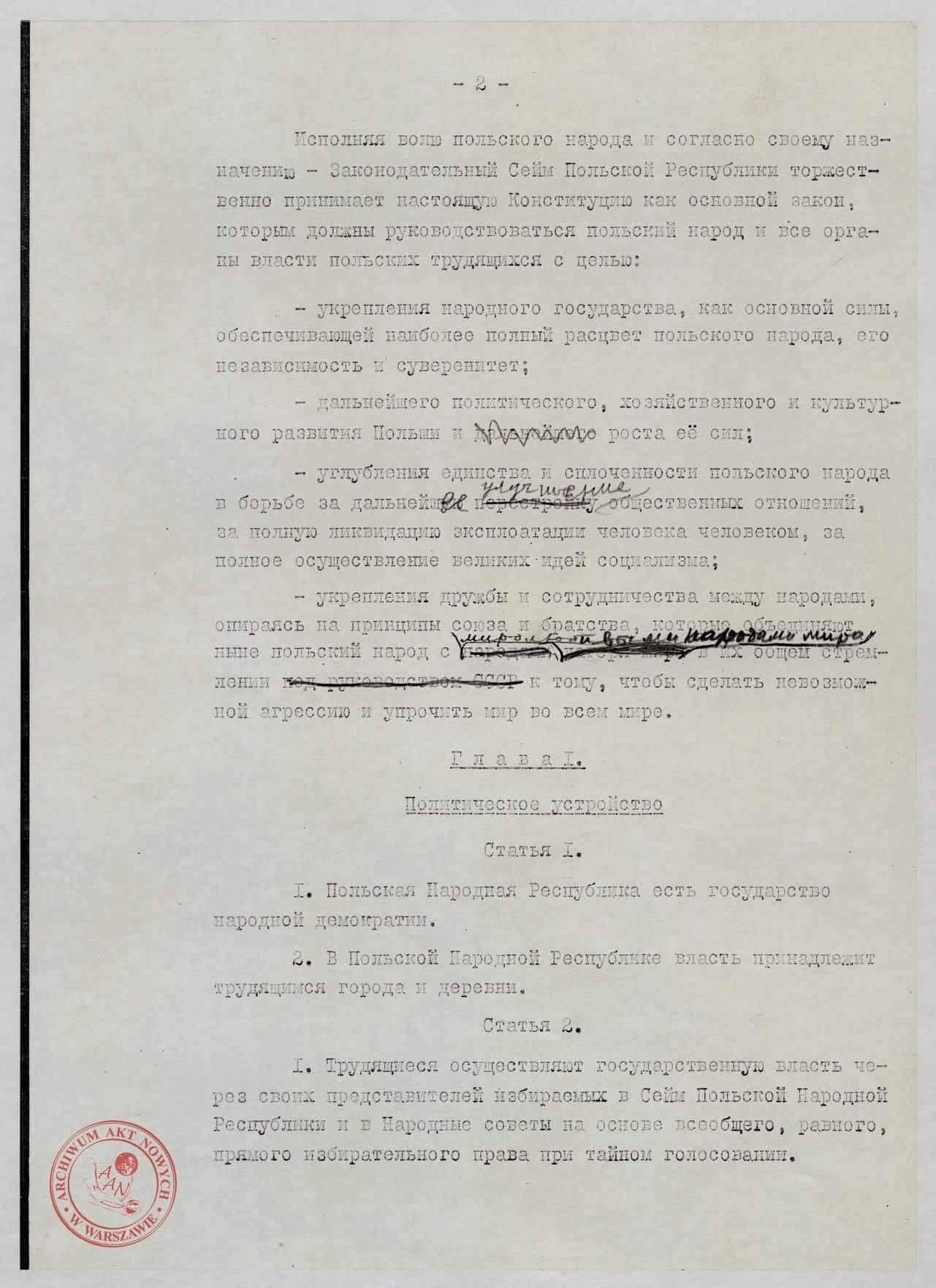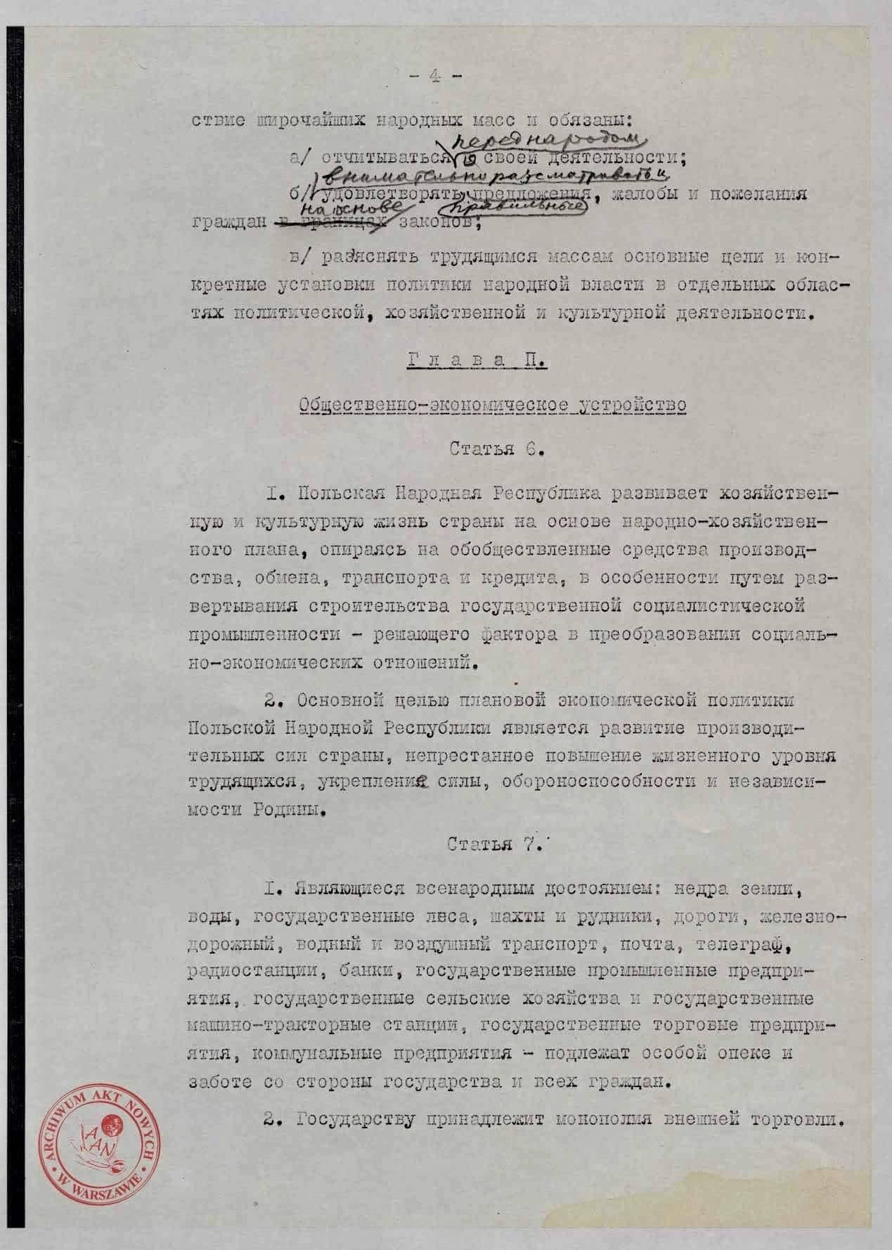 Машинописный текст русскоязычного проекта Конституции ПНР 1951 года с рукописными поправками тов. Сталина