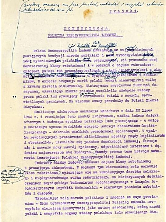 Как написано на сайте архивов, русский машинописный текст был подготовлен Болеславом Берутом с коллегами и осенью 1951 года представлен Сталину для рассмотрения. Сталин внес в общей сложности свыше 50 поправок, из них 14 - в преамбуле.