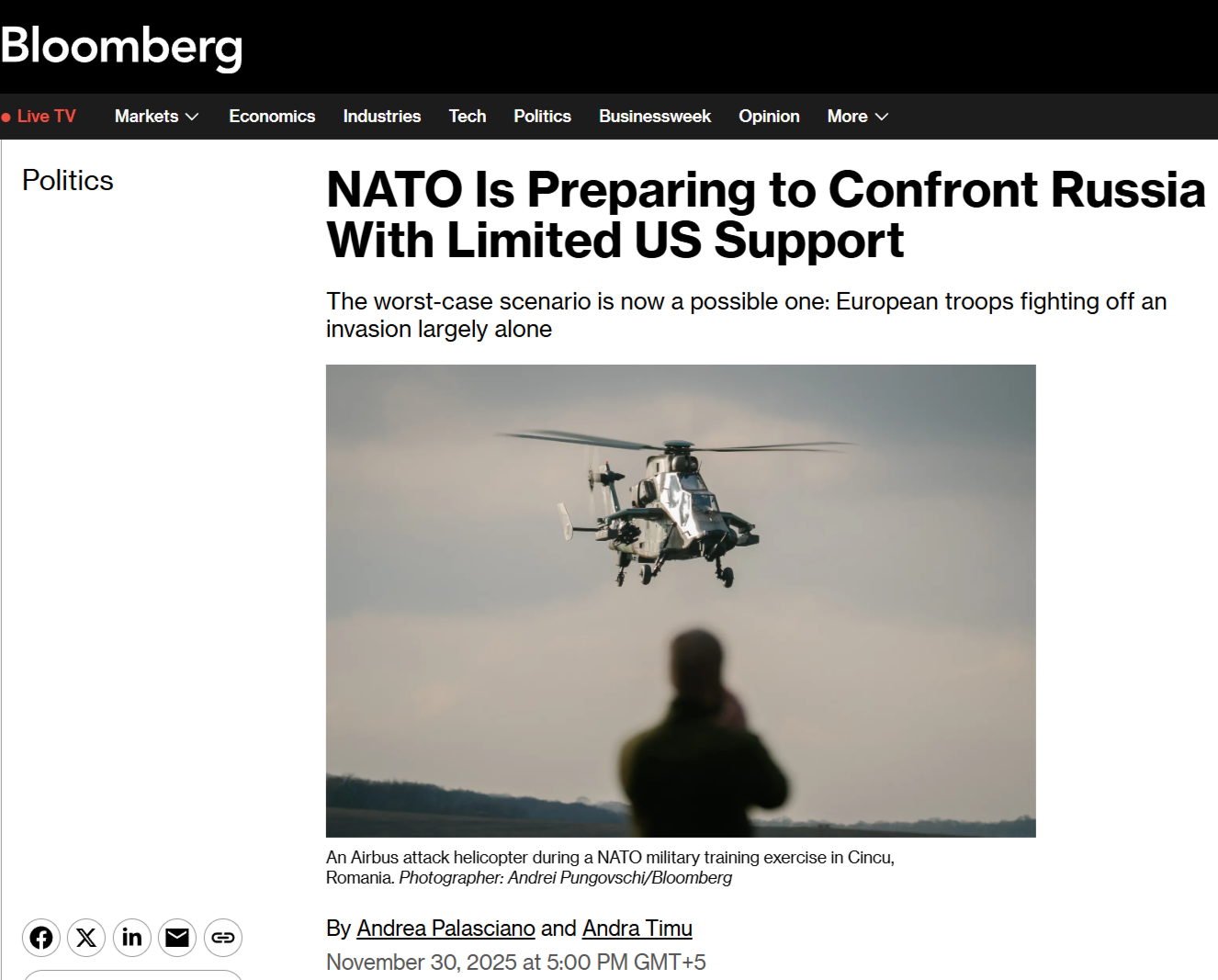 Bloomberg: Военные учения НАТО в ноябре дали представление о вероятном будущем альянса, поскольку президент Дональд Трамп сокращает американские развертывания в Европе. В естественной оборонительной линии Карпатских гор полно-бригадное развертывание европейских солдат под французским командованием в основном обороняло континент без участия США.