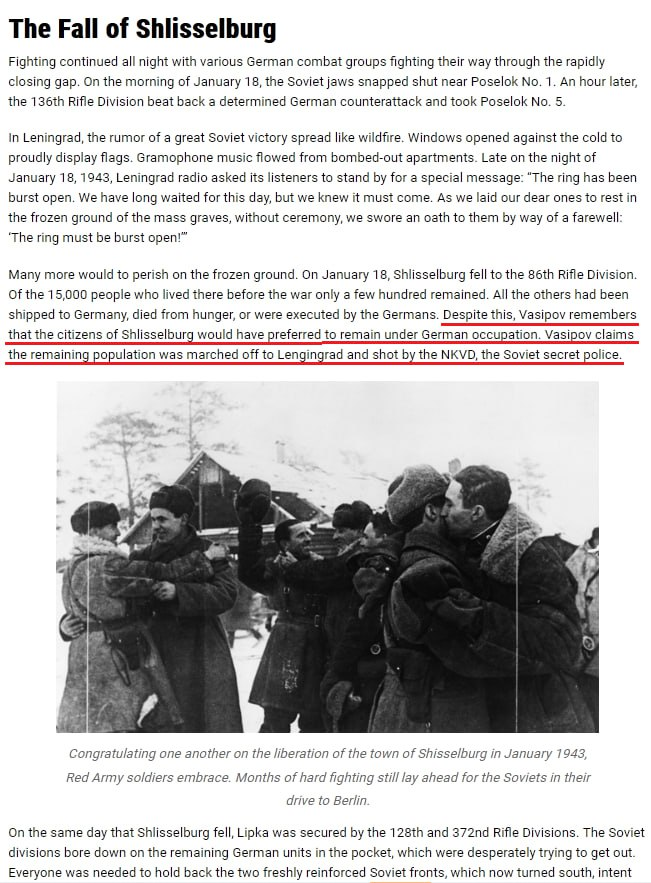 "On January 18, Shlisselburg fell to the 86th Rifle Division. Of the 15,000 people who lived there before the war only a few hundred remained. All the others had been shipped to Germany, died from hunger, or were executed by the Germans. Despite this, Vasipov remembers that the citizens of Shlisselburg would have preferred to remain under German occupation. Vasipov claims the remaining population was marched off to Leningrad and shot by the NKVD, the Soviet secret police."