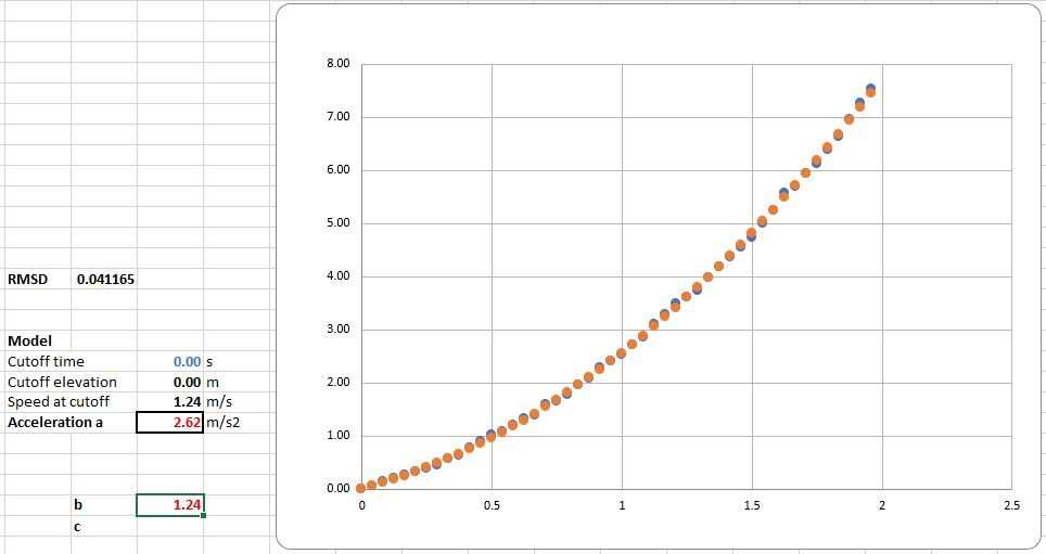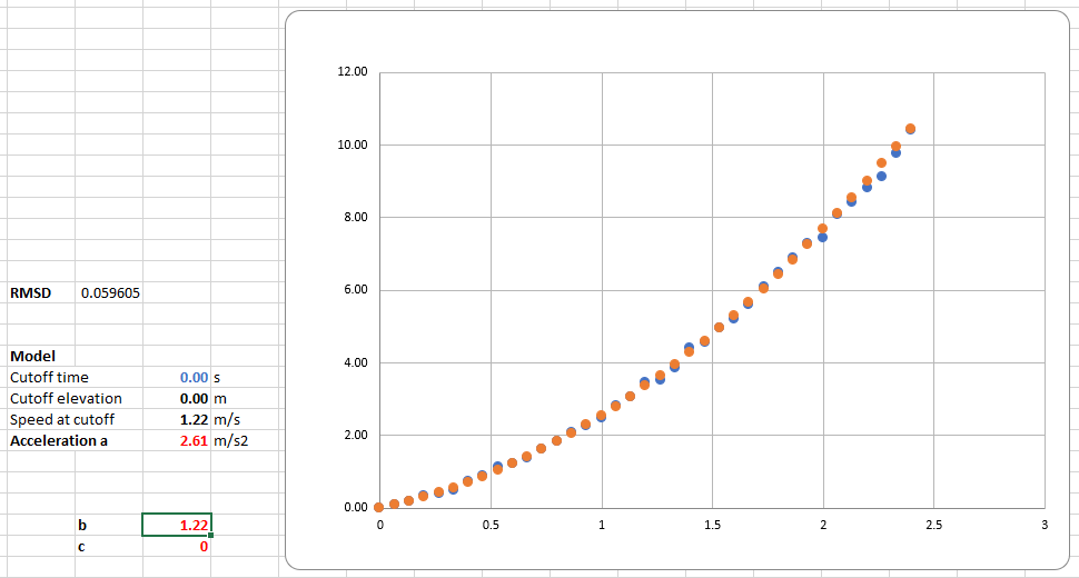 Синим точками отмечены измеренные по видео высоты. Поверх них желтым - подобранная под имеющиеся измерения "модель".