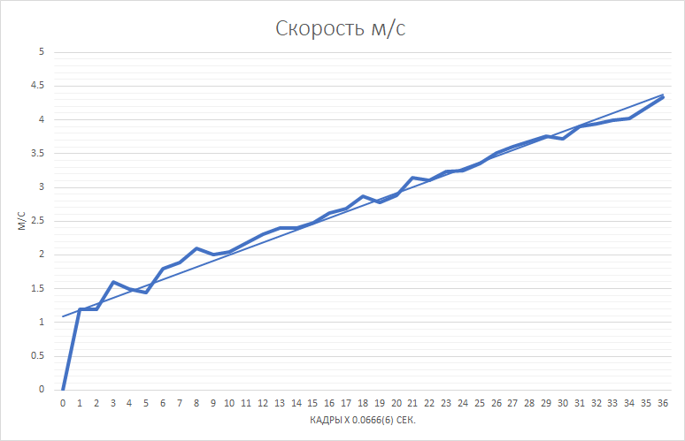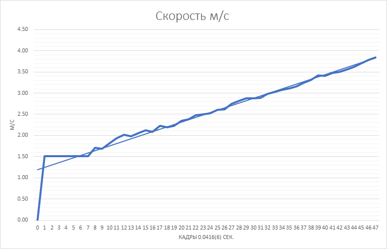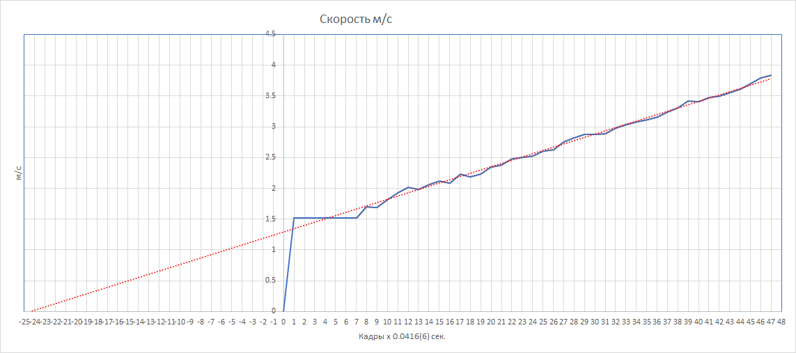 Если же экстраполировать влево линию тренда без учета нулевого состояния, можно оценить за сколько кадров должно было начаться движение ("полететь перья"), чтобы к первому кадру была бы набрана данная скорость. (1,22 м/с)