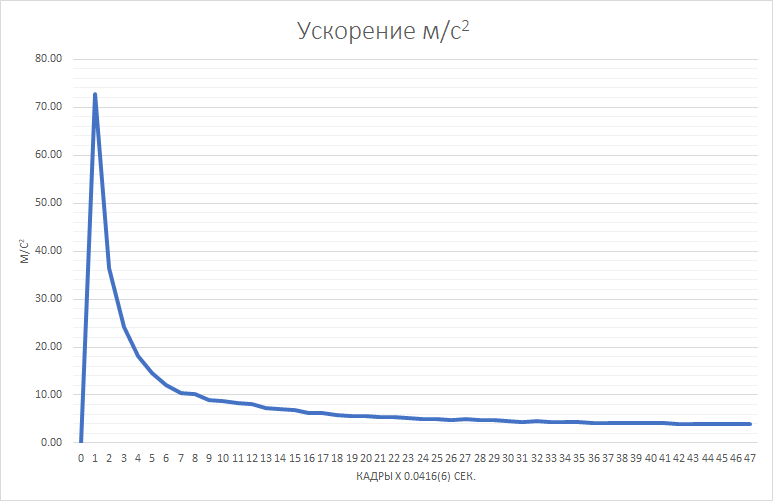 Если мы представим эти же данные в виде покадрового ускорения, то оно окажется практически постоянным (то есть - "равноускоренным") на всем своем протяжении кроме... первого кадра.