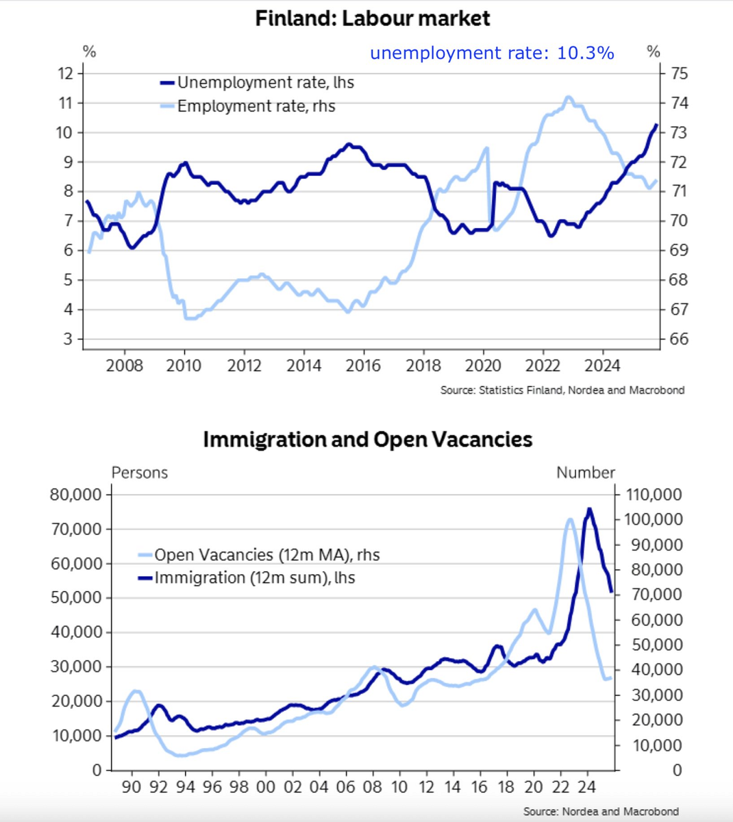 Интересно, что заставляет кривую безработицы в процветающей Финляндской Республике так целенаправленно и безоткатно двигаться вверх, начиная с 2023 года. И увеличится уже чуть ли не в 2 раза.