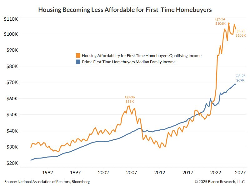 Доход, необходимый для покупки дома в США, составляет 103 тысячи $. Медианный доход домохозяйства, потенциально приобретающего своё первое жильё, 69 тысяч $.