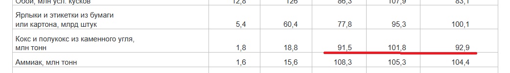 Напоминаю, что после начала СВО в отчётах Росстата были объединены две - "производство кокса" и "производство нефтепродуктов", чтобы враг не отслеживал важный показатель напрямую. Однако в перечне товаров статья "производство кокса и полукокса сохранена", в отличие от статьи "производство бензина и других нефтепродуктов".