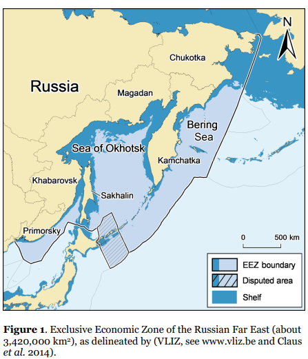 Большая часть Охотского моря относится к исключительной экономической зоне России, за исключением небольшой части, прилегающей к острову Хоккайдо, которая относится к зоне Японии. А у нас с Японией мирного договора нет. Так что хоть ООН и признает Охотское море внутренним морем России, но есть вот это одно обстоятельство - противостояние с Японией, коллизия которая нескоро разрешится.
