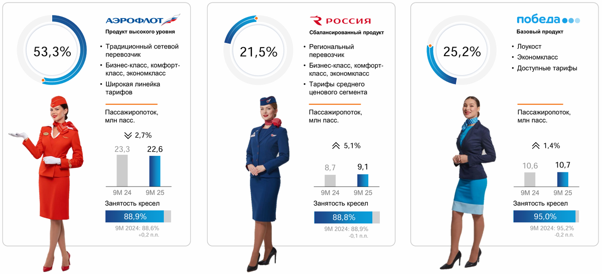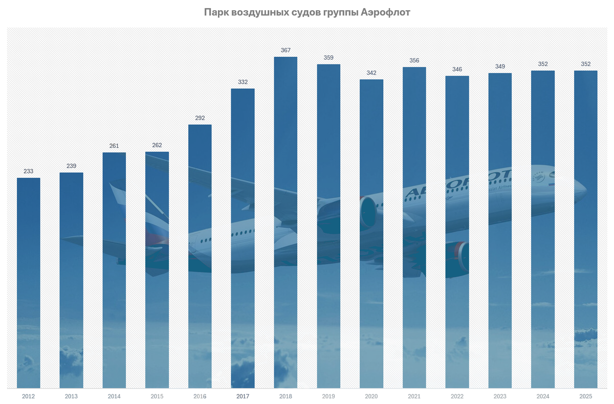 В парке Группы Аэрофлот 352 пассажирских самолётов по состоянию на сентябрь 2025 года. Если брать с грузовыми, то 360. Также надо иметь в виду, что Группа Аэрофлот – это непосредственно сам Аэрофлот, это Россия и это Победа.