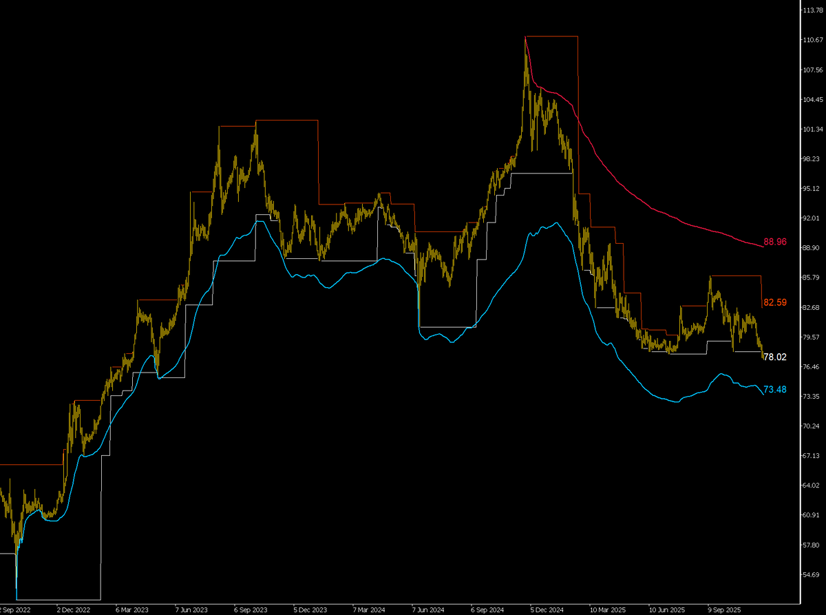 На графике нанесены динамические ценовые границы, который я использую для анализа потенциальных диапазонов движения цены. Так вот нижняя сейчас на 73,48.