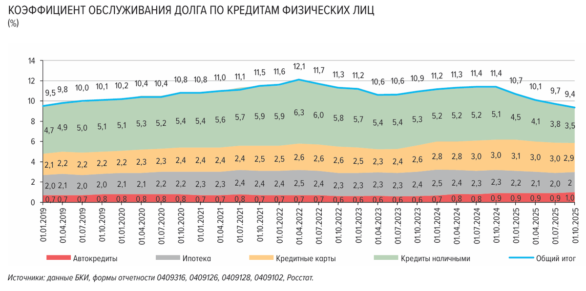 Хотелось бы , что по состоянию на 01.10.2025 коэффициент обслуживания долга, т.е.доля доходов, направляемых населением на обслуживание кредитов, снизился до 9,4%. Это минимальное значение с конца 2018 года.