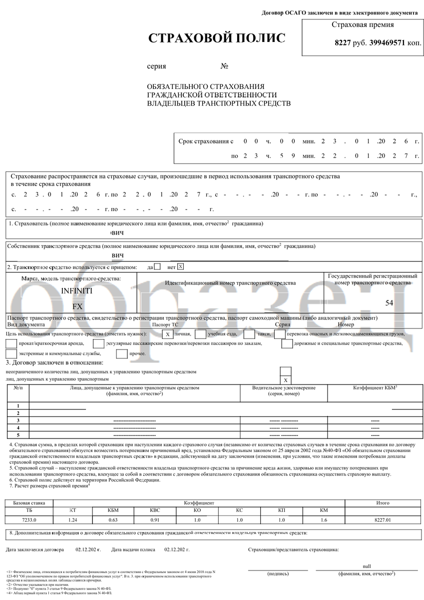 Обратите внимание на образец. Полис начнёт действовать с 23.01.2026. Значения КТ старые.
