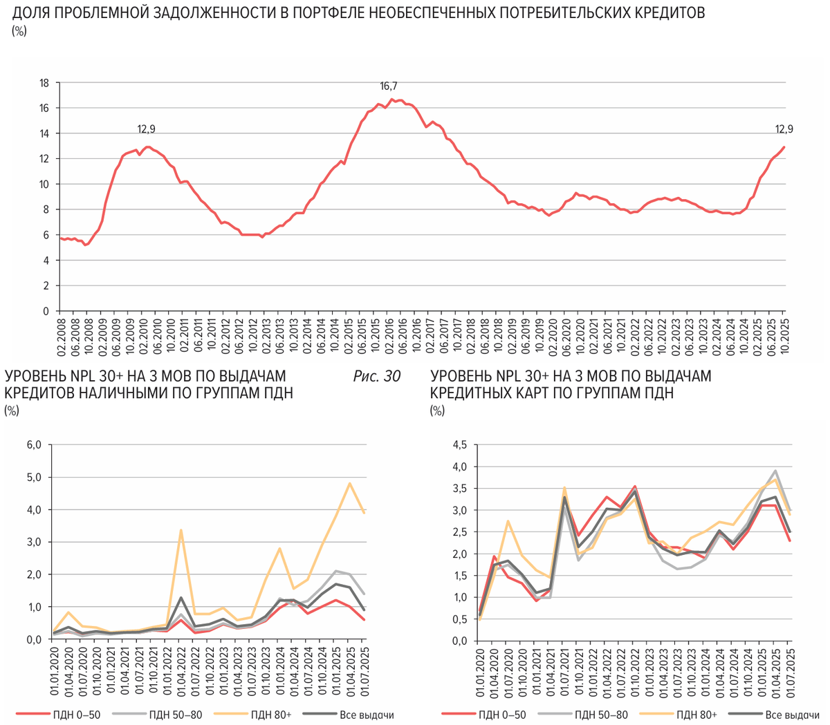 Собственно, это результат борьбы с активной раздачей кредитов, которая привела ухудшению качества обслуживания кредитов. В сегменте необеспеченных потребительских кредитов продолжается рост доли проблемных кредитов (на 01.10.2025 она составила 12,9%). В 2016 эта доля доходила до 16,7%. Т.е. ситуация не сказать, что критичная, плюс в банках неплохо по резервам, но ничего хорошего, конечно в этом нет.