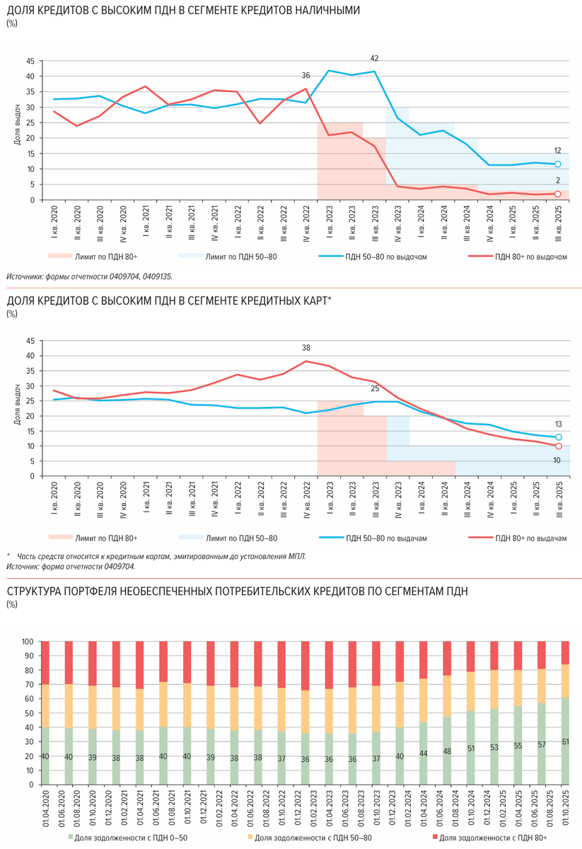 С 2023 Банк России устанавливает прямые ограничения на выдачу потребительских кредитов гражданам с высокой долговой нагрузкой. Общая доля выдач банками необеспеченных потребительских кредитов с ПДН выше 50% составила 19% в III квартале 2025 г. (28% в III квартале 2024 г. и 63% в IV квартале 2022 г. до начала применения МПЛ).