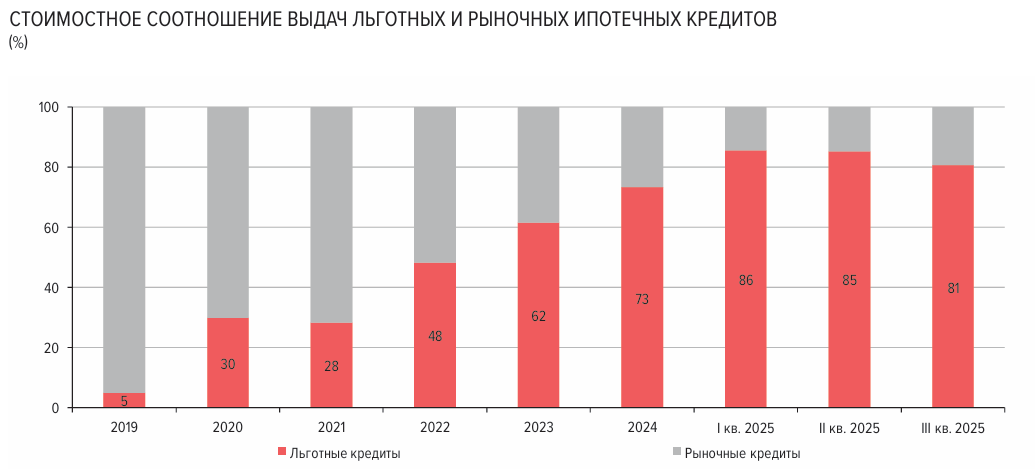 Доля льготных ипотечных кредитов в общей массе ИЖК составила 81%. В пике достигала 86%. Одной «Семейной ипотеки» в 3 квартале 2025 было выдано 805 млрд ₽ (примерно 87% ипотеки с господдержкой).