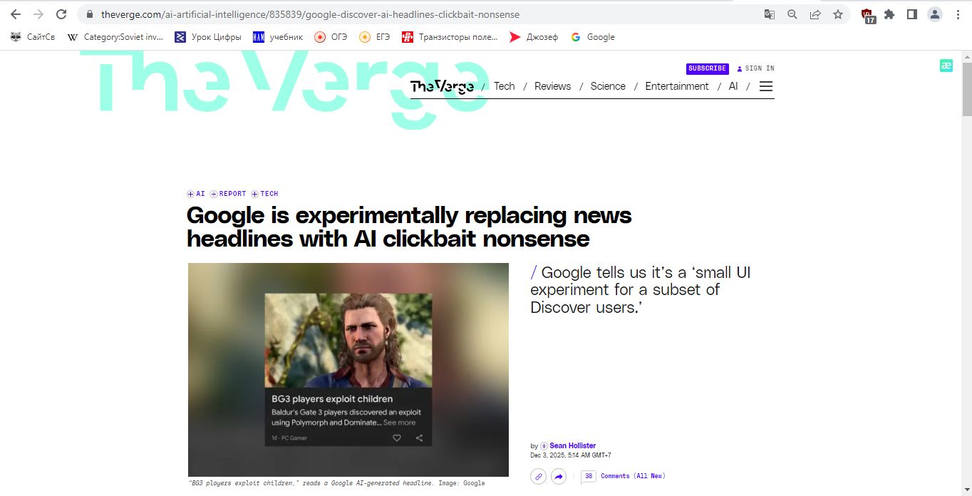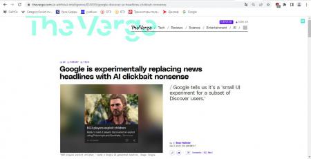 Google тестирует ИИ-заголовки в ленте Discover и подменяет ими оригинальные формулировки новостей. Об этом рассказал старший редактор The Verge Шон Холлистер, который заметил, что в его ленте на смартфоне вместо заголовков изданий стали появляться короткие и нередко вводящие в заблуждение формулировки, сгенерированные ИИ-алгоритмом.
