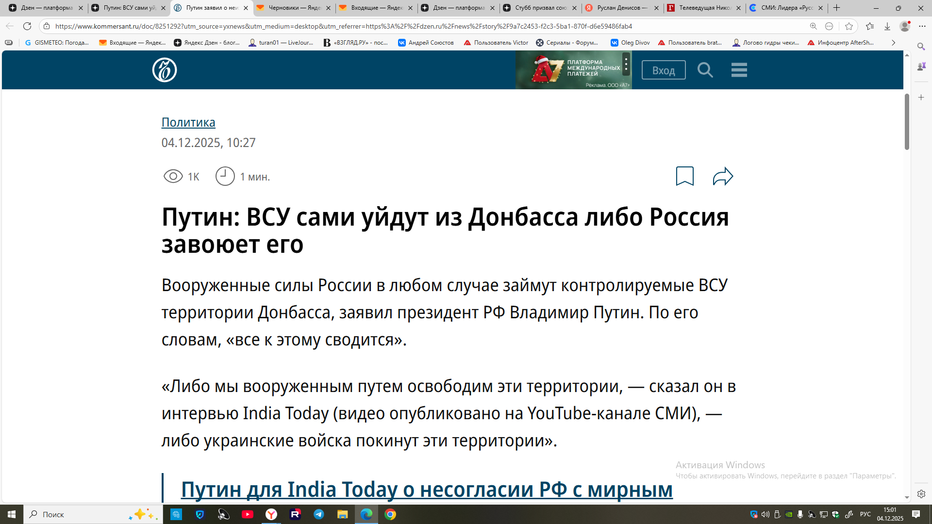 Президент России Владимир Путин в интервью India Today заявил, что территории Донбасса и Новороссии будут освобождены в любом случае. По его словам, есть два варианта развития событий: военный путь и добровольный уход ВСУ.