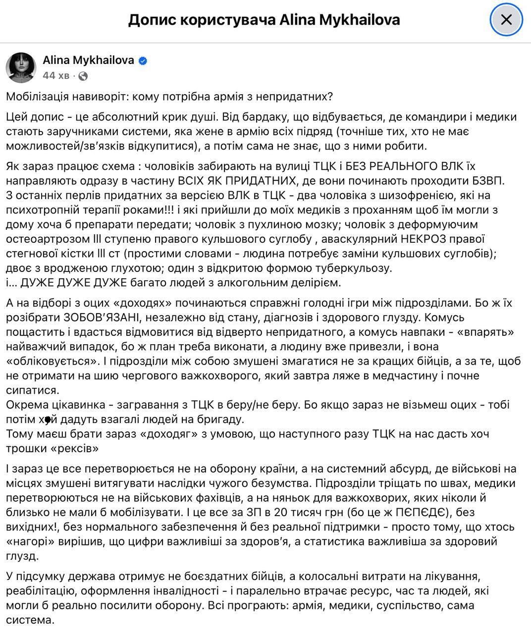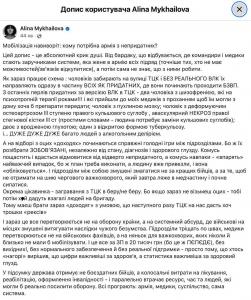 Немного реалий украинской мобилизации от киевского депутата Алины Михайловой, командира медицинской службы «Ульф». (перевод с украинского)