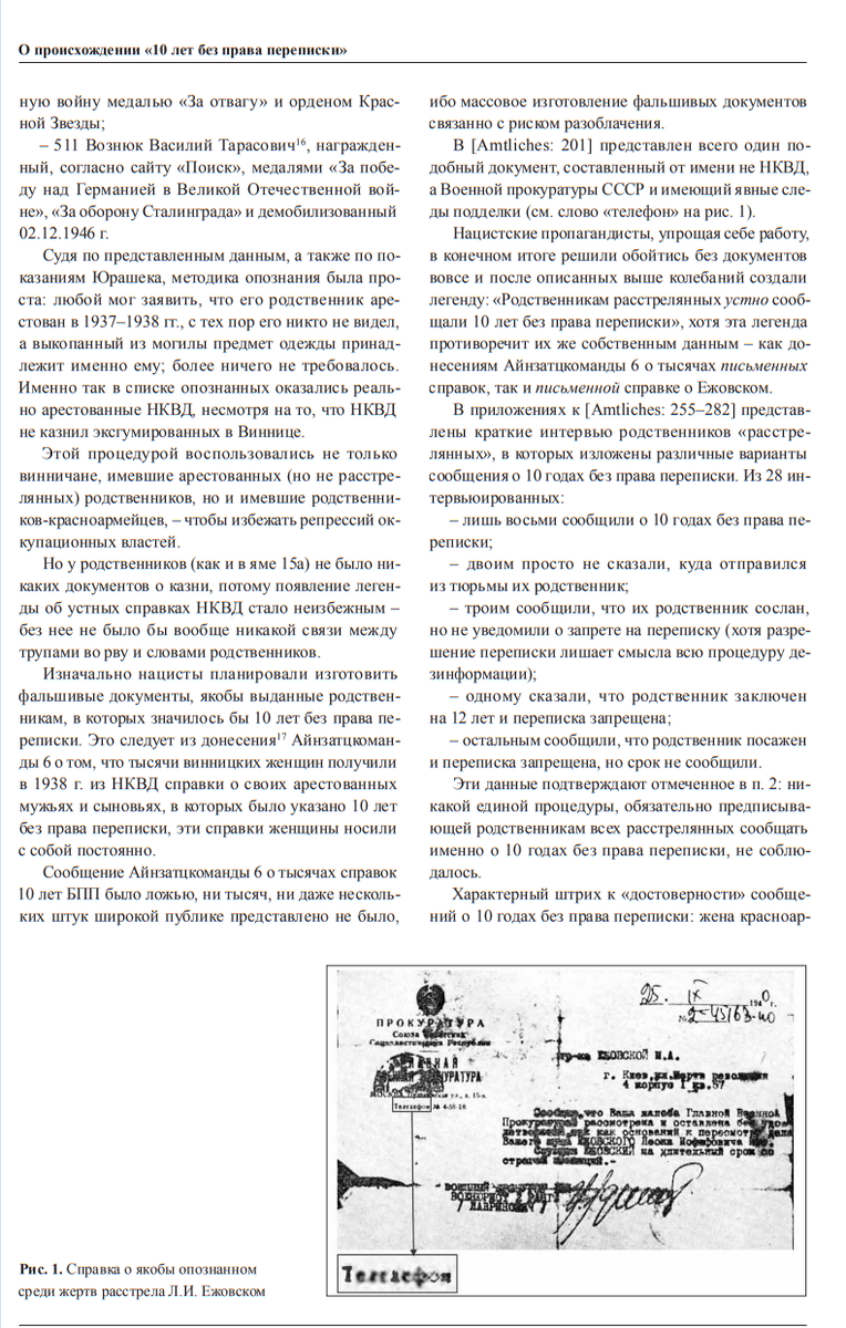 Если вдруг кому-то интересно - замечания при приеме статьи были только по оформлению и объему. А основная мысль статьи - 10 лет расстрела без права переписки выдумали немцы - у профессиональных историков возражений не вызвала.