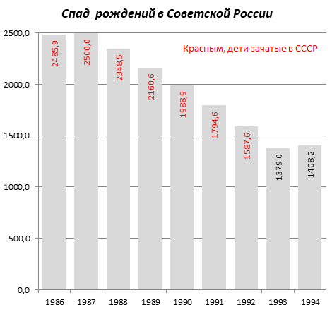«Крупнейшая геополитическая катастрофа века» всего за шесть лет (1988-1993), ополовинила русскую рождаемость: если в 1987 году она была ≈ 2 100 000; то в 1993 году – 1 038 183. Это потянуло вниз общие показатели демографии РСФСР-РФ. В 1987 году общая рождаемость в РСФСР была – 2 499 974; в 1993 году уже в РФ – 1 379 000; в 1999 году – 1 214 689, а в 2024 году – 1 222 408.