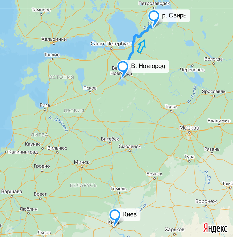 Непонятно о какой исторической достоверности предлагаемого Дюку маршрута идет речь. В нем пропущено Ладожское озеро, через которое только и можно попасть с реки Волхов в реку Свирь. Но главное, этот маршрут ведет в противоположном от Киева направлении (рис. 3). Как по рекам Волхову и Свирь Дюк Степанович смог попасть потом в Киев историки не объясняют.