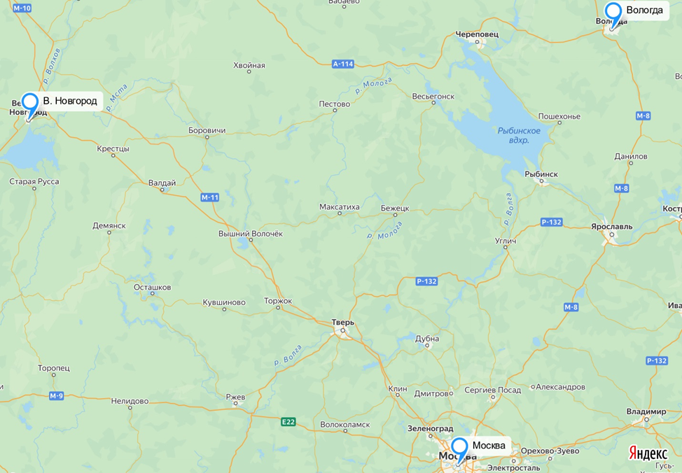 Рис.4. В. Новгород, Москва и Вологда на карте.