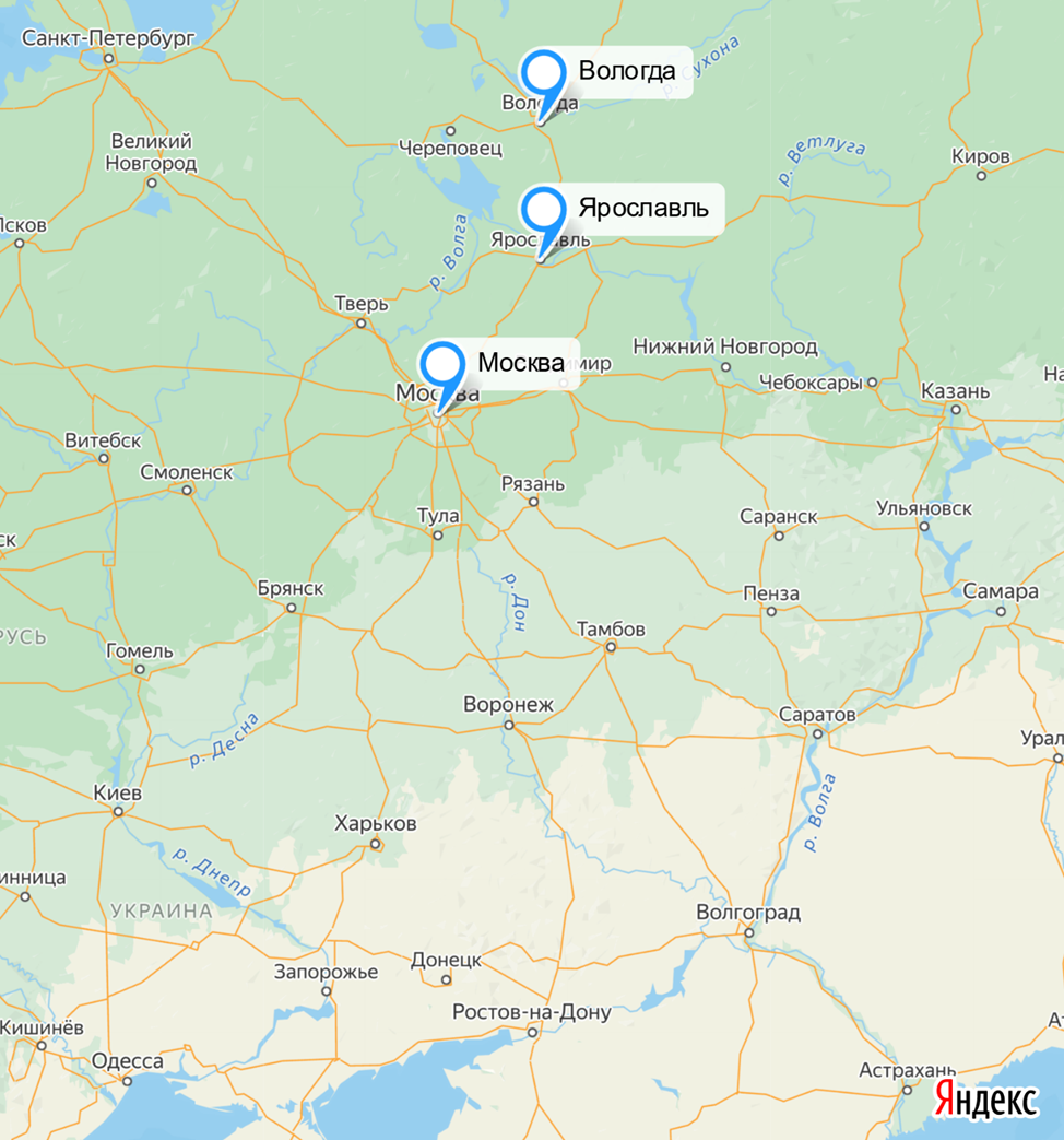 Рис.6. Москва, Ярославль, Вологда и река Волга на карте.