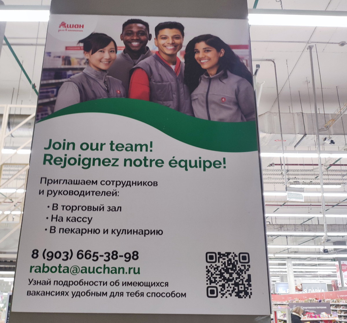 Попалась реклама в одном из магазинов Ашан. Мне кажется, что тут кого-то не хватает. Ашан фирма французская, это их русофобия? То есть они никуда не ушли, желают работать в России , но местные им не подходят. Это как понимать? У них здесь 230 магазинов, 30 000 рабочих мест, но им подходят только те, кто обозначит на плакате? Или так во Франции и так должно быть здесь?