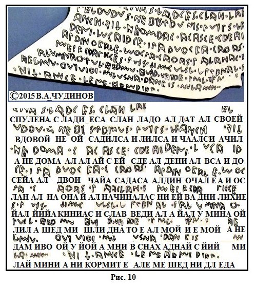 Последнее слова написано уже на третьей строке. Пятое предложение: АЧИЛ, А НЕ ДОМА АЛ. Иначе говоря, ПОЧИЛ, НО НЕ ДОМА БЫЛ. Шестое предложение: АЛ АЙ С ЕЙ. Слово АЙ - акающее произношение слова ОЙ (ОН). Перевод: БЫЛА Я С НИМ. Седьмое предложение: СДЕ АЛ, то есть, ЗДЕСЬ БЫЛ, или ЗДЕСЬ БЫЛА.