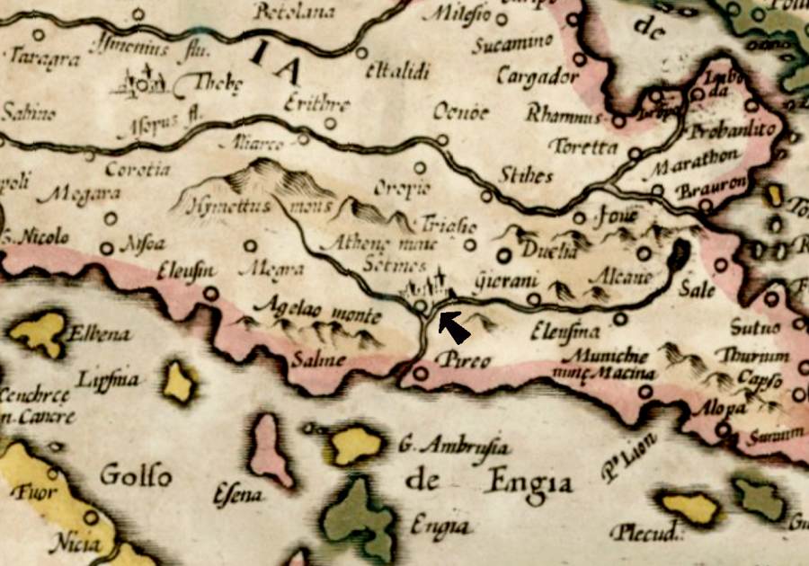 Рис.118. Фрагмент карты Греции из Атласа Ортелия 1598 года. Город Афины на этой карте отсутствует, а на том месте, где сегодня находятся Афины, отмечен город Сетия (Setiue). Взято из [1321:00], с.95