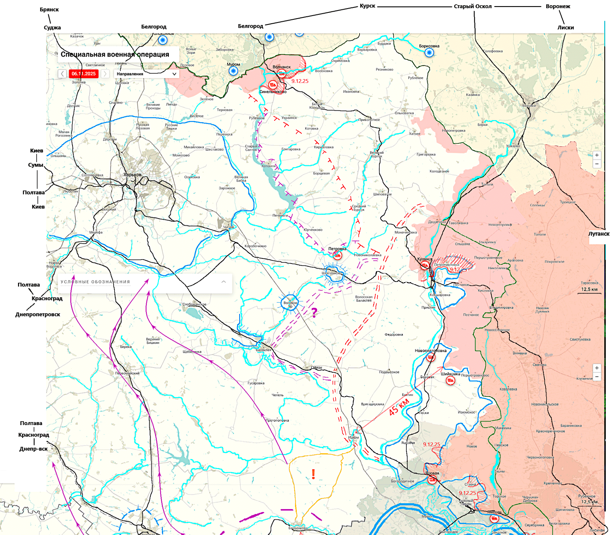 Важно подложка - карта от РИА "Новости" по состоянию на 5.11.2025, изменения линии боевого соприкосновения прочерчены по состоянию на 9.12.2025 опять же по данным РИА "Новости". Даты Красные без подчёркивания - по состоянию на 9.12.2025, с подчёркиванием время за которое достигнуто продвижение, но остановилось на 9.12.2025.