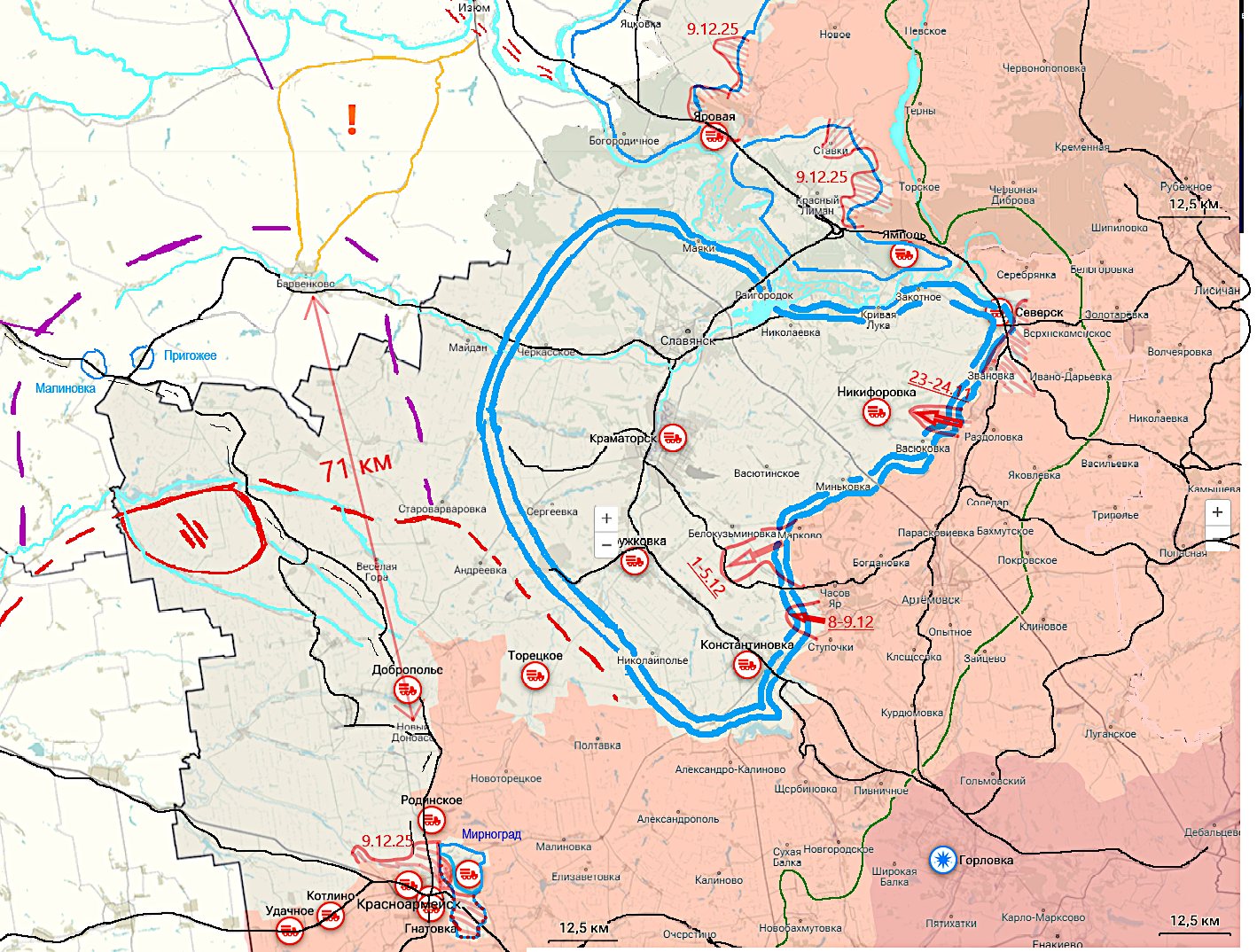 А вот тут, первое, что толкнуло взяться за фломастеры досрочно, с 1 по 5 декабря 2025 г. ВС РФ наносит тактический удар в стык между г. Дружковка и г. Константиновка около 8 км в глубину и 4 км по фронту и не останавливаясь на достигнутом бьёт от Ступочек и Часова Яра в направлении Константиновки (удар не завершён). Ранее в ноябре 25 г. нанесён удар в направлении Никифоровки, но дальнейшего развития не получил. Возможно дальнейшее продвижение было парировано ВСУ или остановлено по другим причинам, вклинение до 7 в глубину и до 3 км по фронту. Вроде и небольшие удары, но если вспомнить, что от Авдеевки до Красноармейска ВС РФ наступали со средним темпом 4,3 км в месяц, то такие прорывы теперь весьма чувствительны для ВСУ и случаются чаще.