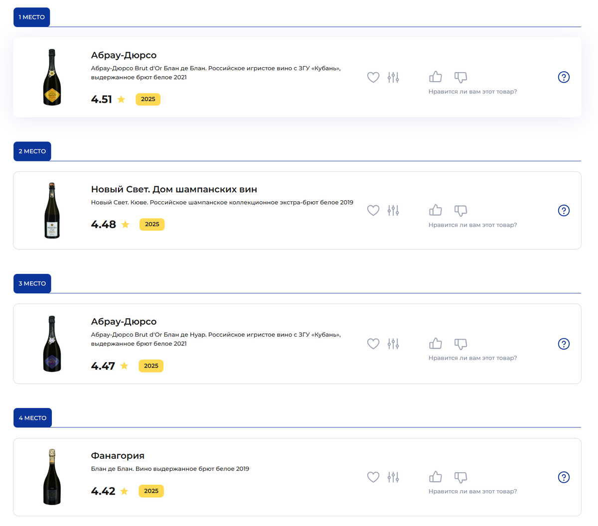 На первых четырёх местах представители Абрау-Дюрсо, Нового Света и Фанагории.
